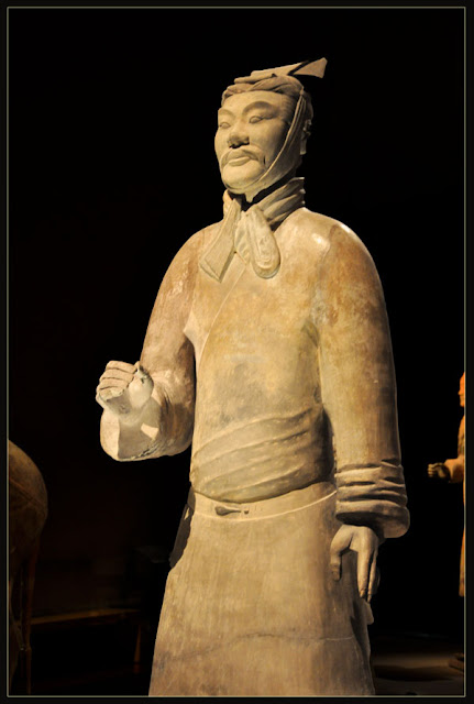 Officers can be identified by their moustaches and headdresses. They were also taller than the average terracotta soldier, but not as tall as a general.
